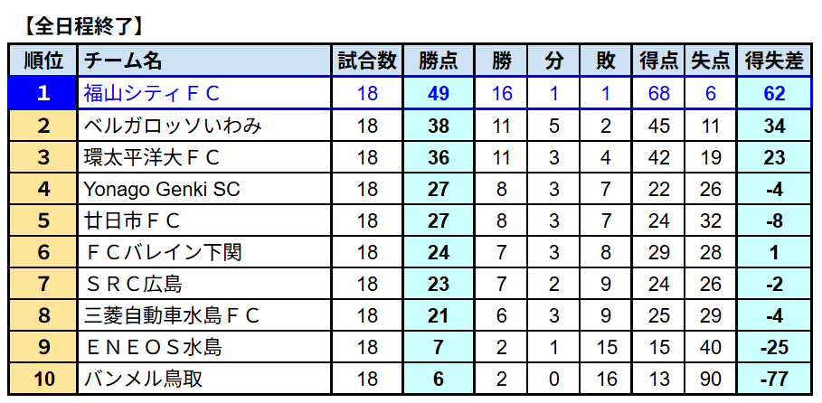 中国サッカーリーグは第17節の時点で福山シティFCが優勝を決め、これでリーグ4連覇となりました。