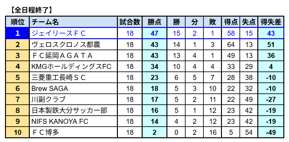 九州サッカーリーグは2025年9月7日に開催された第18節の結果によりジェイリースFCの優勝が決定しています。