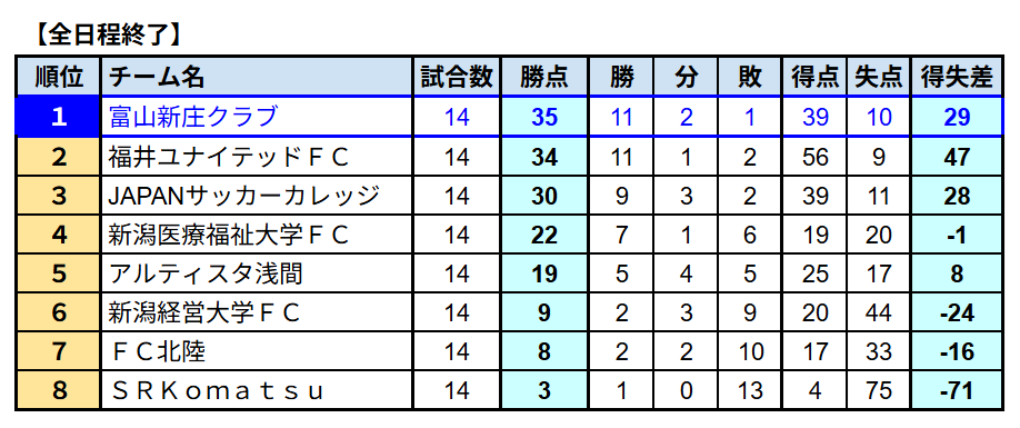 北信越フットボールリーグDIVISION1は第13節に富山新庄クラブが優勝を決めています。