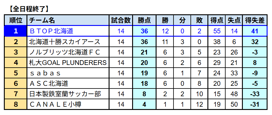 北海道サッカーリーグの最終節は北海道十勝スカイアースとBTОP北海道の直接対決があり、十勝が勝利してBTОPに勝ち点で並んだものの得失点差で及ばず、BTОP北海道の優勝となりました。