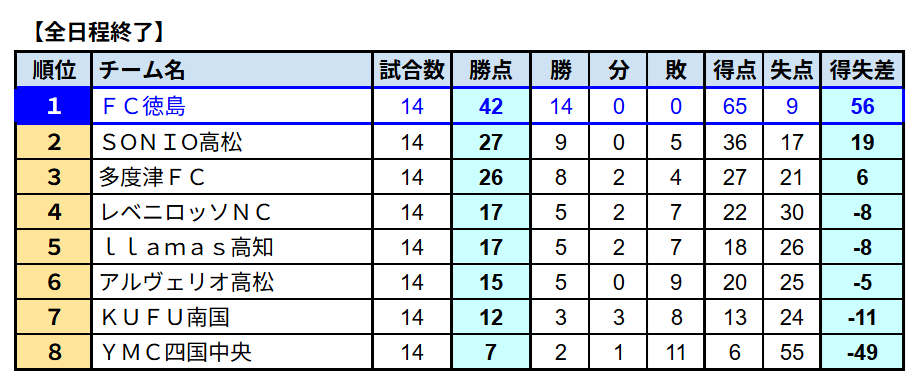 四国サッカーリーグは第12節の時点でFC徳島が優勝を決めています。