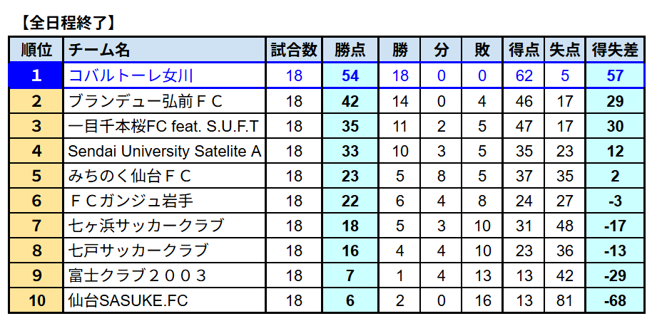 東北社会人サッカーリーグ1部は第16節の時点でコバルトーレ女川が優勝を決めています。