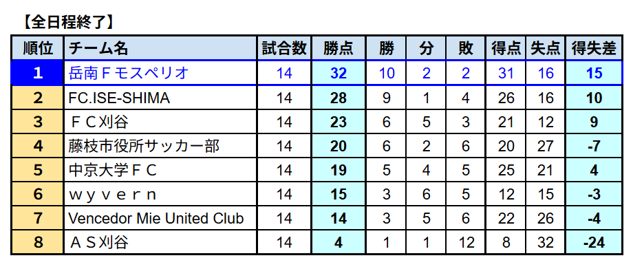 東海社会人サッカーリーグ1部は岳南Fモスペリオが初優勝を決めています。