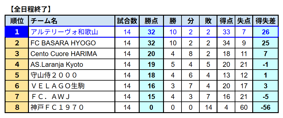 関西サッカーリーグDivision1は最終節、アルテリーヴォ和歌山とFC BASARA HYOGOが共に勝利し勝ち点で並びましたがアルテリーヴォ和歌山が得失点差でわずかに「1」上回り優勝を決めました。