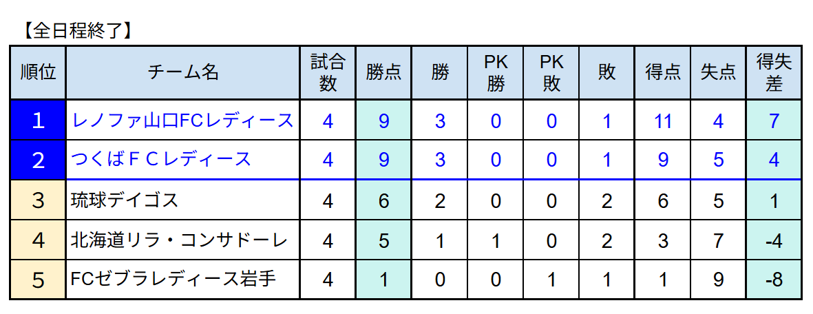 入替戦予選大会は全日程を終了し順位が確定。1位・レノファ山口FCレディース、2位・つくばFCレディースとなりました。