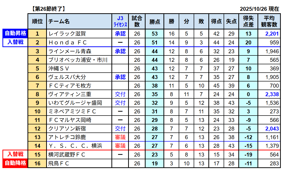 2025シーズンJFL第26節終了時の順位表とホームゲーム平均観客数は下記の通りです。